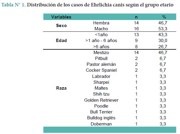 En relación a la edad, el 73,3 % de los perros era menor de 6 años, siendo el grupo más predominante los menores de 1 año (43,3%) en comparación con los perros mayores de 6 años (26,7%). Asimismo, fue más frecuente observar perros mestizos con Ehrlichia canis (46,7%) en comparación con las otras razas (Tabla 1).