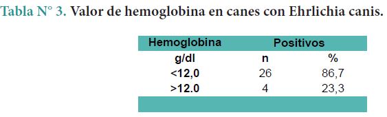 El 86,70% (n= 26) de los canes con valor bajo de hemoglobina (<12g/dl) fue positivo a Ehrlichia canis, y el 23,3% (n=4) restante presentaban valores normales (Tabla 3).