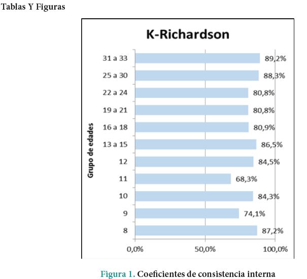 En cuanto a la confiabilidad del instrumento, el coeficiente de consistencia interna más bajo obtenido fue 68,3 % para los ítems correspondientes a la edad de 11 meses. El más alto fue 89,2 para la edad de 31 a 36 meses. No se ha podido determinar el coeficiente correspondiente a las edades de 0 a 7 meses, debido a la insuficiente cantidad de niños evaluados en esas edades. (Ver figura 1).