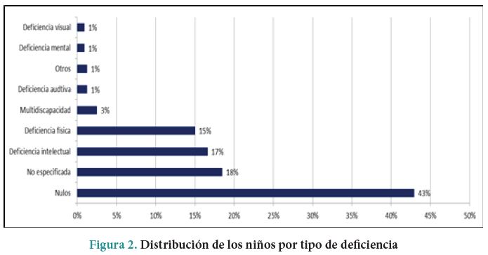 El 43 % de los niños evaluados no cuenta con la mención del tipo de deficiencia. A esto debe sumarse un 18 % de casos en los que se ha hecho definiciones no ubicables objetivamente como deficiencias, tales como: “retraso motor”, “retraso psicomotor” o “retraso del lenguaje”. Por tanto, no ha sido posible utilizar un 61 % de estos datos.