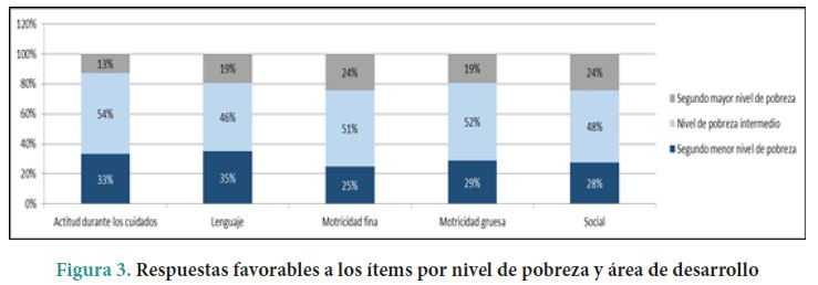 Las respuestas favorables ante los reactivos de la Escala, se concentran en mayor medida en los departamentos ubicados en el tercero de los cinco niveles de pobreza monetaria, determinados por el Instituto Nacional de Estadística (14 p52), seguidos por aquellos con el segundo menor nivel de pobreza. El grupo con menos respuestas favorables es el de los departamentos con el segundo mayor nivel de pobreza a nivel nacional; esto es constante en todas las áreas de desarrollo evaluadas. No están representados en la muestra, los departamentos con el mayor y menor nivel de pobreza, respectivamente. (Ver figura 3).